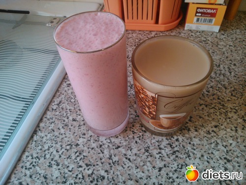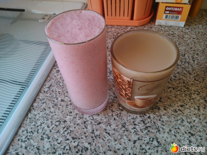 Завтрак - коктейль (натуральный йогурт, молоко, красная смородина), кофе с молоком...