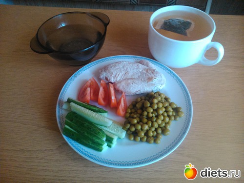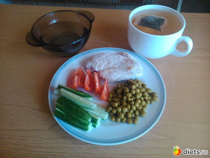 Обед - куриный бульон, вареная грудка, огурец, помидор, зеленый горошек, чай...