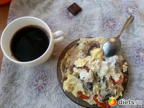 Забив в калькулятор все продукты, обнаружила, что от яиц много жиров. В омлете их 2 штуки. Завтра попробую убрать растительное масло, 1 яйцо и добавить побольше черри.