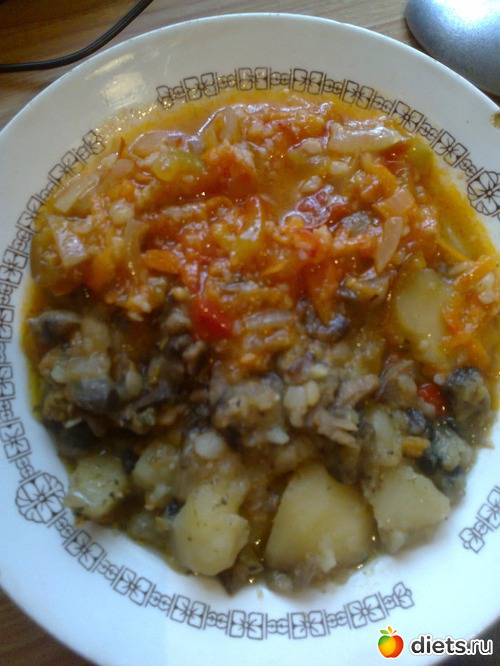 я тушила картошку с грибами, лучком и морковкой, получилось очень вкусно!