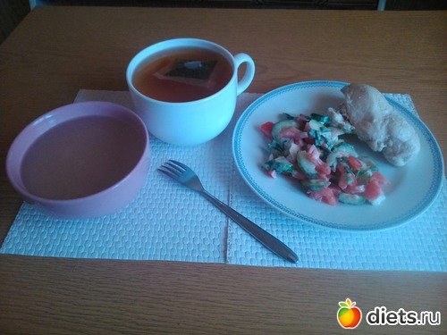 Обед - куриный бульон, вареная куриная грудка, салат из помидор, огурцов, зеленого лука, натурального йогурта и чай...