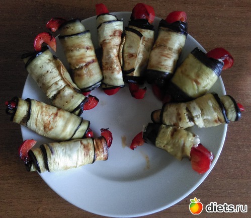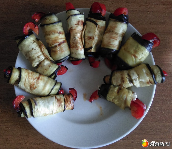 сделала рулетики с баклажаном, чесноком, перцем сладким, орехами и постным майонезом (очень вкусно получилось, даже сфотографировала их);