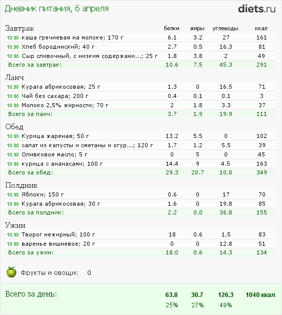 А у вас что то калорий маловато. Ужин можно бы сделать и посытнее, да и ланч тоже. Неужели вы курагой наедаетесь? Я б только больше есть захотела.