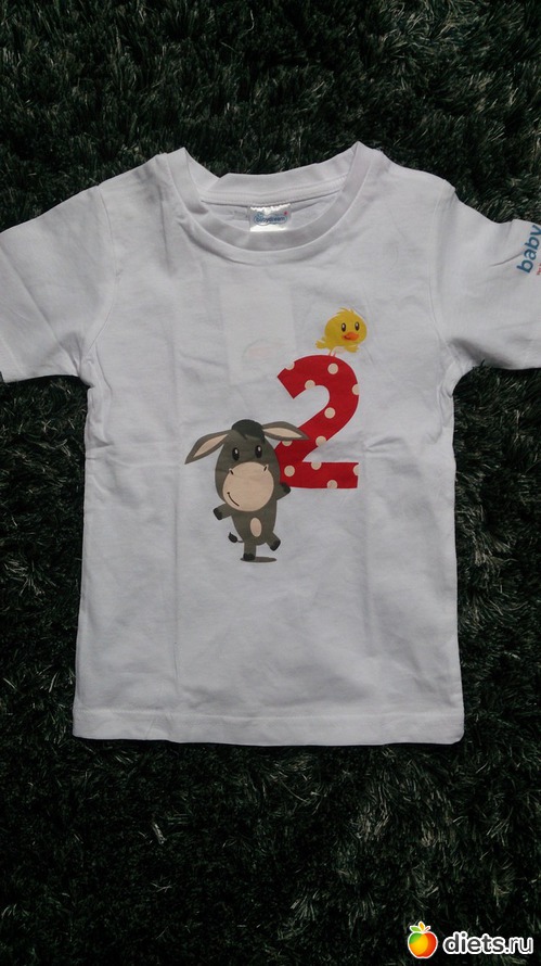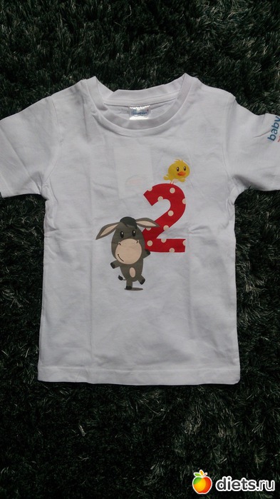 А эта футболка пришла в подарок с магазина ко дню рождения, еще была бумажная корона (которую забыла совсем взять с собой на др, приглашения и купоны на скидку для товаров в садик)