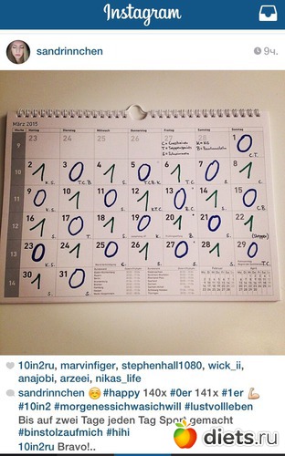 Вот так выглядел очередной месяц Сандры. 140-"0", 141-"1". Каждый день, за исключением двух дней- спорт.
