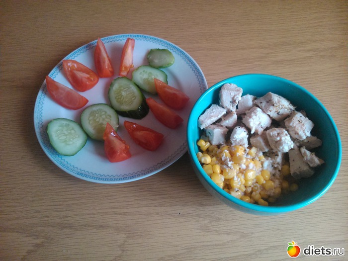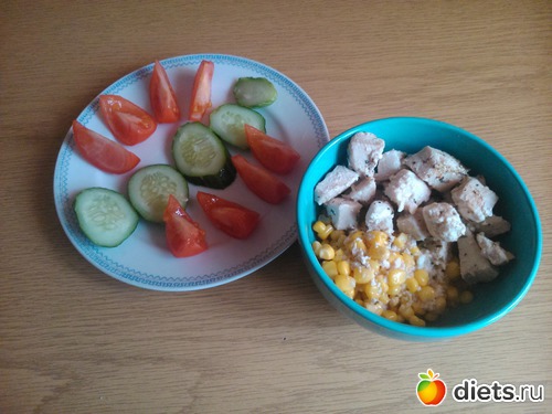 Обед - кукуруза, куриная грудка тушеная в натуральном йогурте, помидор, огурец...