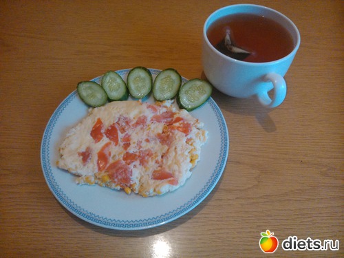 Ужин - омлет из 1 яйца с кукурузой и помидором, огурчик, чай...