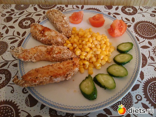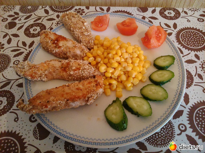 Обед - куриная грудка в овсяной панировке и запеченная в духовке, кукуруза, помидорка, огурчик...