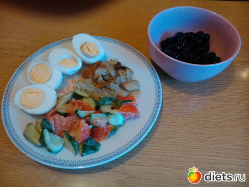 Ужин - 70г жареной картошки (мужу готовила, но так захотелось, так что немного позволила), 2 яйца, салат из помидор, огурцов и натурального йогурта, а на десерт замороженные ягоды (смородина и крыжовник) - съела половину порции..