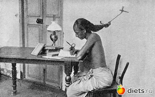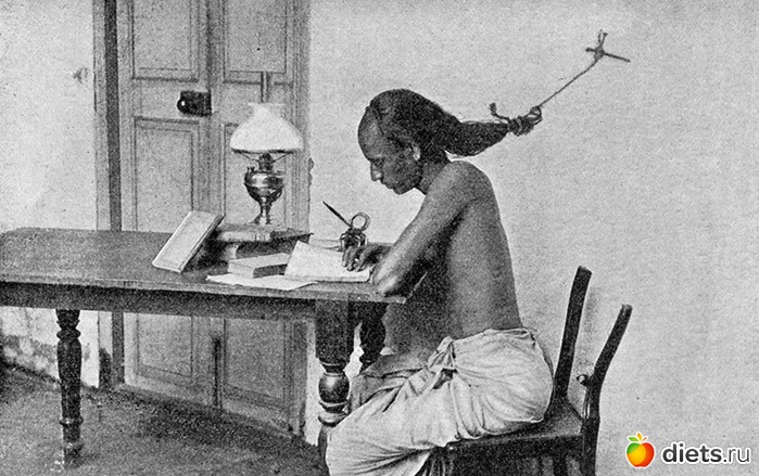 1900. Индийский студент готовится к экзаменам. Чтобы не заснуть, привязал свои волосы к стене.