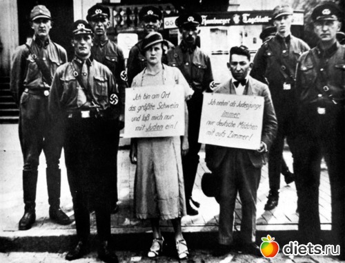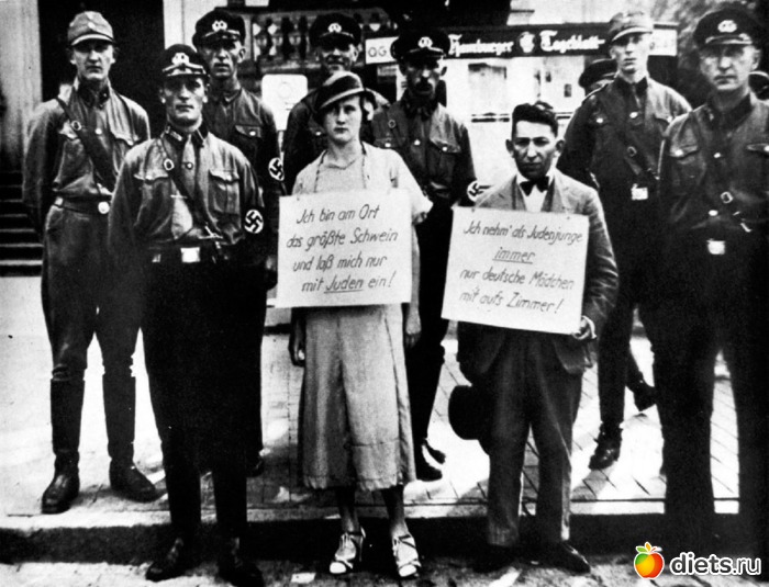 1935. Штурмовики позируют вместе с нарушителями закона о расовой чистоте. На шее женщины плакат «Я большая свинья и я даю только евреям!». На шее мужчины плакат «Я еврей, только что пригласивший немецкую девушку к себе в комнату».