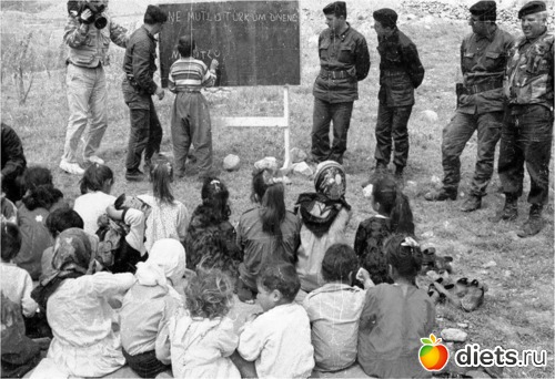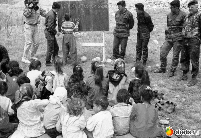 Под присмотром офицеров турецкой армии курдские дети пишут на доске «Как счастлив тот, кто называет себя турком».