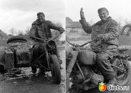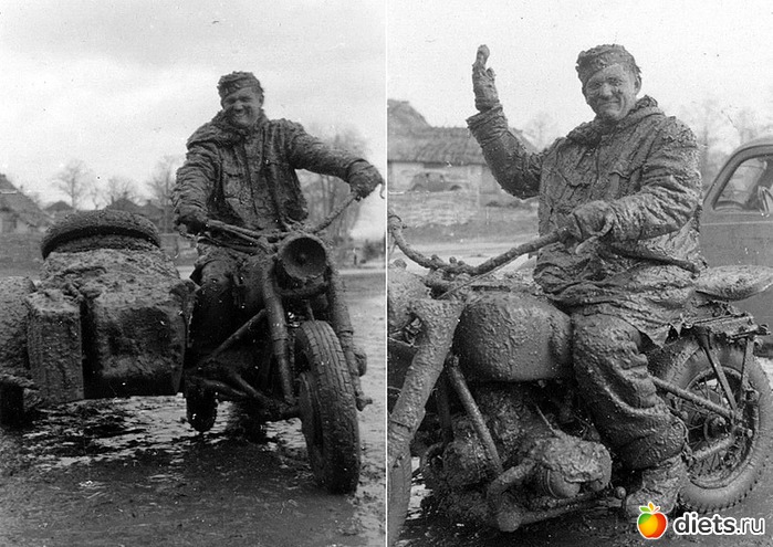 1943 год. Немецкий мотоциклист показывает, что это такое — русская распутица.