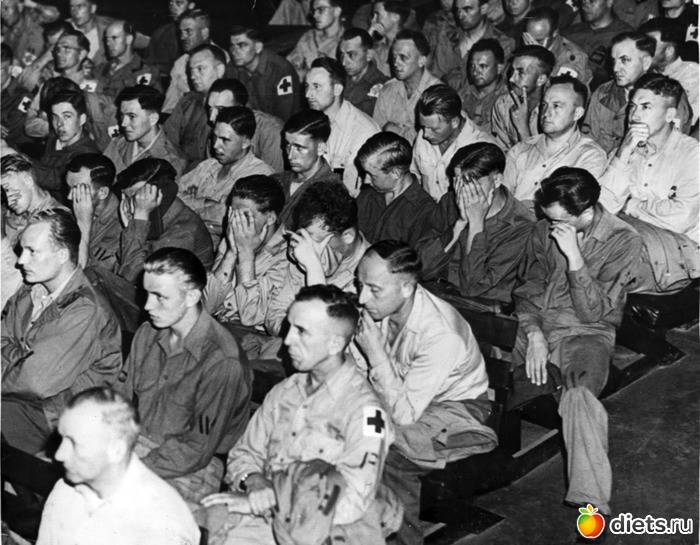 1945. Пленные немцы принудительно смотрят кинохронику из концлагерей.