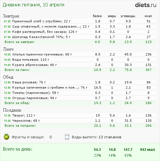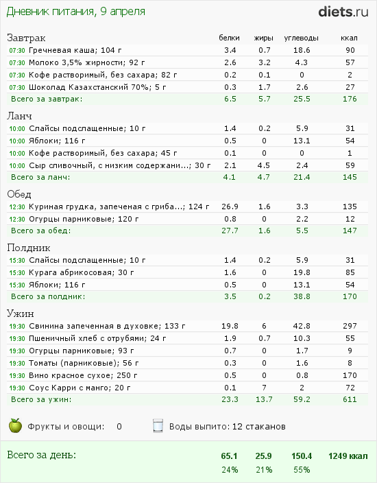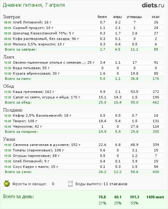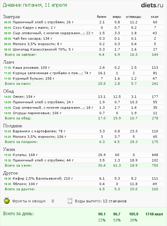 Дневник питания не вела сегодня. Завтракала не сильно зажорно (яйцо + запеканка + чай с молоком + кулича немного), Обед, плавно переходящий в ужин был во дворе у родителей: шашлык + овощи и т.д. и т.п.