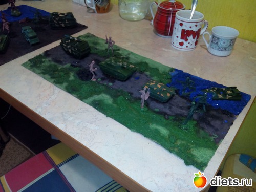 для детей 2 и 5 лет-это просто им нужно только дать волшебную краску-перепешать соль,манку,клей пва и гуашь-так на картоне они руками размазали поле боя и сами фигурки расставили.