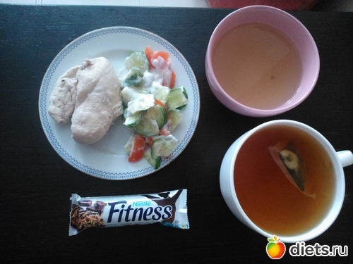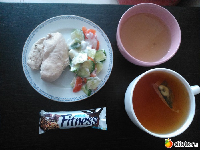 Обед - куриный бульон, вареная грудка, салат из помидор и огурцов, чай, батончик фитнес...