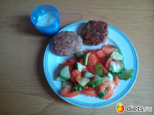 Ужин - 2 говяжьи котлетки, соус из натурального йогурта, салат из помидор и огурцов...