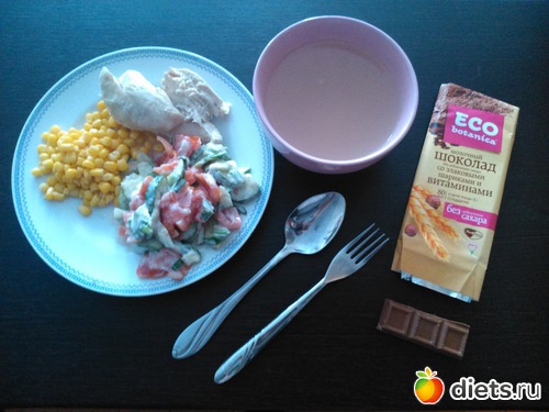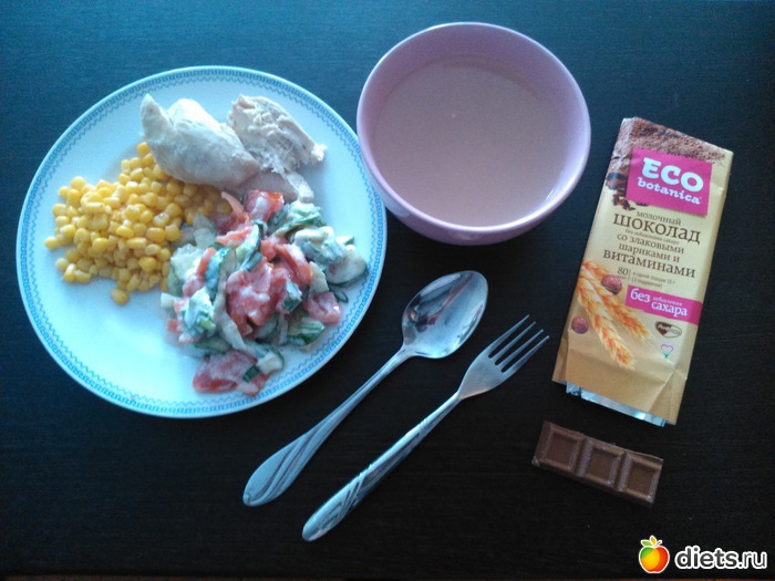 Обед - салат из помидор и огурцов с натуральным йогуртом. кукуруза, вареная грудка, куриный бульон, долька шоколада...