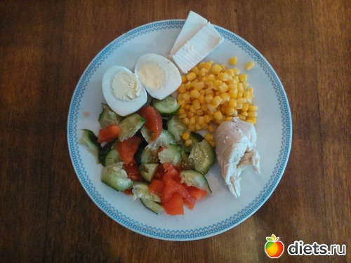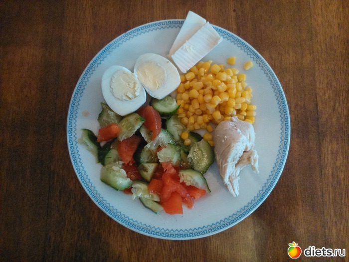 Ужин - вареная грудка, яйцо, салат из помидор и огурцов, кукуруза, плавленный сыр..