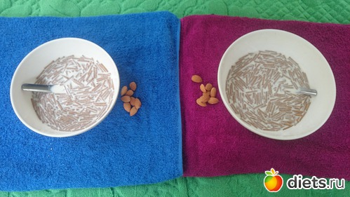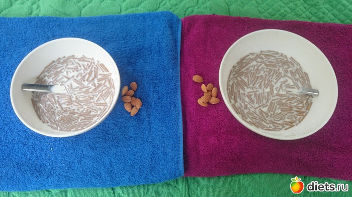 Второй завтрак сделала нам с ребенком одинаковый - молоко с отрубями и по 8 орешков миндаля.
