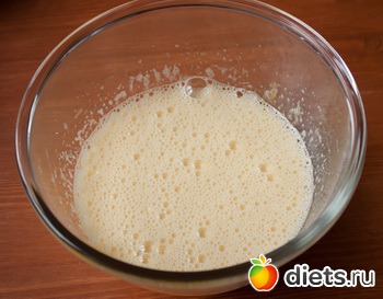 Взбиваем миксером яйца, желтки, сахар, ванильный сахар. Добавляем молочно-дрожжевую смесь и опару. Перемешиваем.