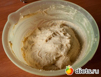 Соединяем растертую с маслом муку и дрожжевую смесь, замешиваем однородное тесто.