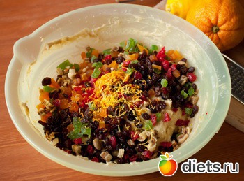 Добавляем нарезанные цукаты и сухофрукты, лимонную и апельсиновую цедру.