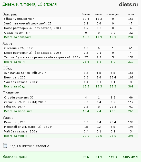 Калории в пределах, вот жиры перебрала))) Но в целом я молодец! Вечером после работы поднялась домой(на 8 этаж пешком), два раза, немного прогулялась))) Красота. Но вот вес не радует, встала утром на весы, и офигела... 69 кг((( Хочу и буду 57кг!