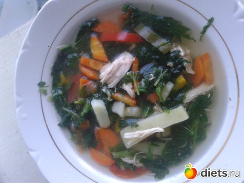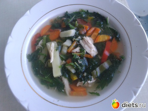 Конкретно сегодня у меня было немного бульона от свареной вчера 1-й грудки и остатки самой этой грудки. Я мелко покрошила остатки грудки в этот бульон, долила туда еще водички, поставила закипать, тем временем быстренько почистила 2 небольшие картошки, порезала соломкой, закинула, 1 небольшую морковку, тоже соломкой закинула и горстку болгарского перца (у меня замороженый и уже порезаный), 1 крупную помидорку, все это вскипнуло до готовности, в конце добавила вымытую и порезанную крапиву. 2-3 минуты вскипнуло и отключаю. вкуснятина)