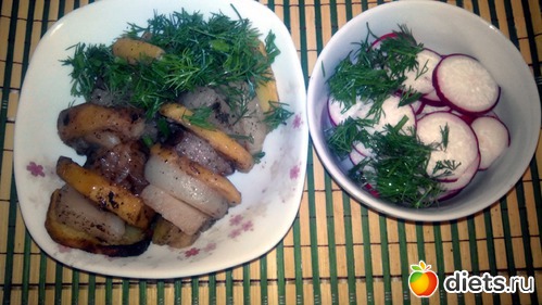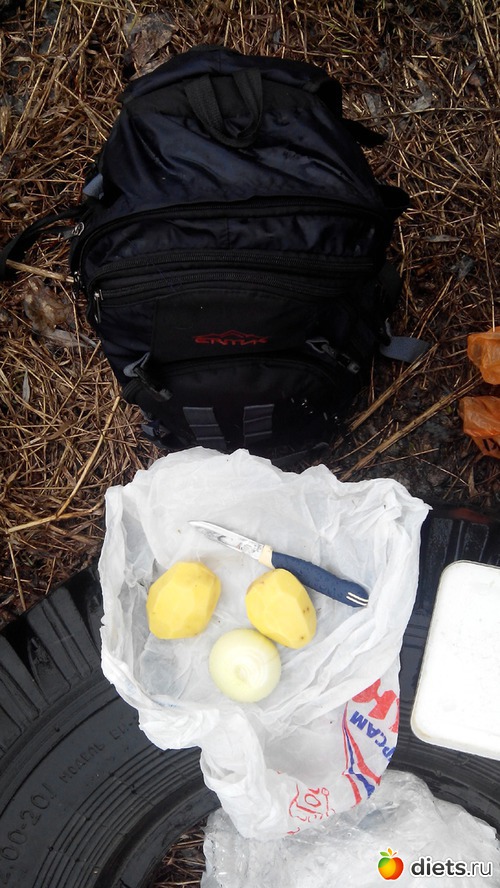 На самом деле при разбивке на весь день выходит не так уж и много. Грамм сто сала, две средних картофелины и пара луковиц. И это разделенное на два приема пищи. Плюс немалое количество потраченной энергии. Все-таки несколько часов движняка под дождем...