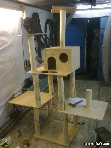 Как только я решила завести кота, я сразу подумала о его личном доме, где он будет спать и играть. Покупка отпала сразу, т. к. цены на эти котодома запредельные (от 7000 и выше). Перерыв кучу информации в интернете я остановила свой выбор на огромном котодоме. Муж всегда поддерживает мои безумные идеи, поэтому я даже не переживала, так что рабочая сила была практически бесплатной. Осталось только приступить. Материал мы приобрели в отпуске, ткань и нить покупали уже по месту (хотя лучше бы брали в отпуске, тут у нас цены не реальные).