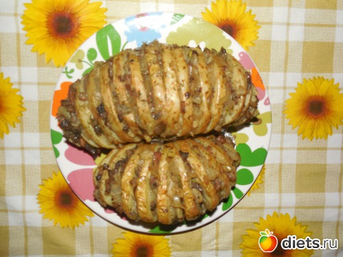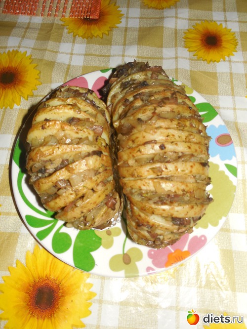 Готовила ее и раньше, вот сидела думала чтоб такое заварганить, завтра может времени и не быть, и пошла на кухню, думаю, думаю и вот пришла мысль сделать это простое и вкусное блюдо. Простое потому что делаю в СВЧ 10 минут/700В- 1)картофель моется, наДрезается(не отрезается)дольками нужно оставить снизу небольшое расстояние, чтобы потом было удобно отодвигать дольки и вкладывать начинку, 2)кладется в пакет(обычный полиэтиленовый мешочек, делается 1-2 прокола, пакетик нужен чтобы картошечка не ссохлась, дырочка чтоб грелась и мешок не лопнул)ставим в микроволновку, 3)в это время подготавливаю начинку(в немного спассированные лук и чеснок бросаем грибочки порезанные, соль специи по вкусу), 4)потом достаю картоху, она готова, 5)затем вкладываю начинку между разрезов (нужно немного подождать пока чуток остынет, т.к картошка готова и дольки слипаются), и вообщем все, получается готовое блюдо, но я еще ставлю на 1-2 минуты запекать в духовку. Получается шикарно