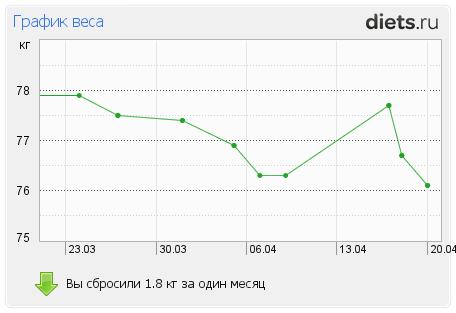 Мой вес почти дошел до цифры 75, 76 и 1! Это очень здорово! Я безумно рада. Значит все мои труды проходят не зря, значит скоро будут мои первые победы в борьбе с лишним жиром! Моя первая цель как раз и есть 75 кг. Надеюсь она скоро покажется на весах. Кстати вот мой небольшой график по весу