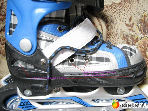Сейчас на примере ролика ребенка покажу (кстати раздвижные). Вот это светоотрожатели, а дырочки это дополнительная вентиляция отинка (они с двух сторон). А то многие путают и думают что сетка это и есть вентиляция (она в принципе и в этих целях тоже, только не значительная, так как находиться внизу ботинка)