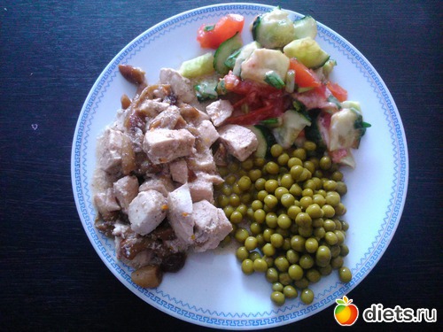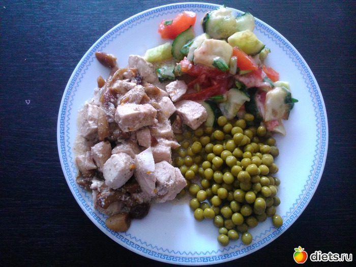 Обед - куриная грудка с опятами тушеная в натуральном йогурте, зеленый горошек, салат... К чаю - мандаринка...
