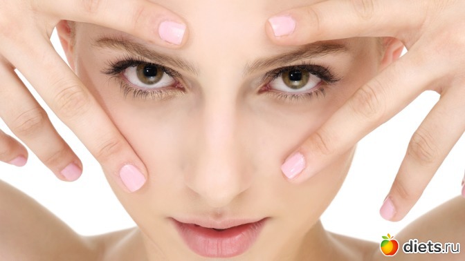6. Повторяем предыдущее упражнение для век, положив подушечки указательных пальцев чуть выше внутренних уголков глаз.