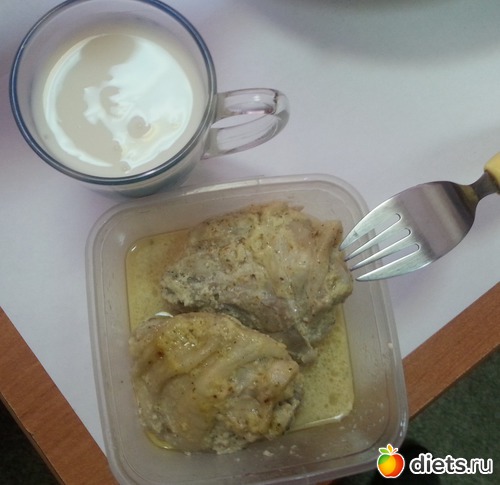 Обед:Куриное бедро без кожицы 2 небольшие штучки, 2 ст.л. винегрета (угощение), кефир