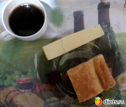 Завтрак:Пирог (еще один кусочек от угощения на ДР), сыр, долька шоколада и кофе
