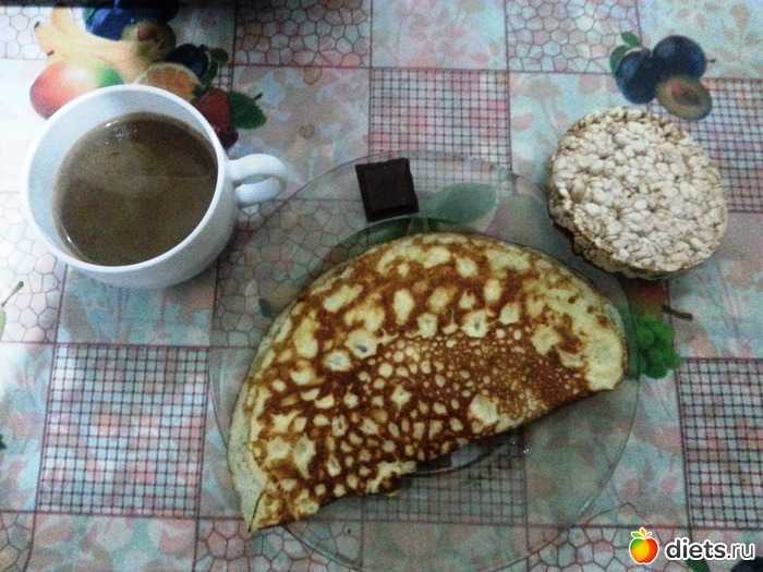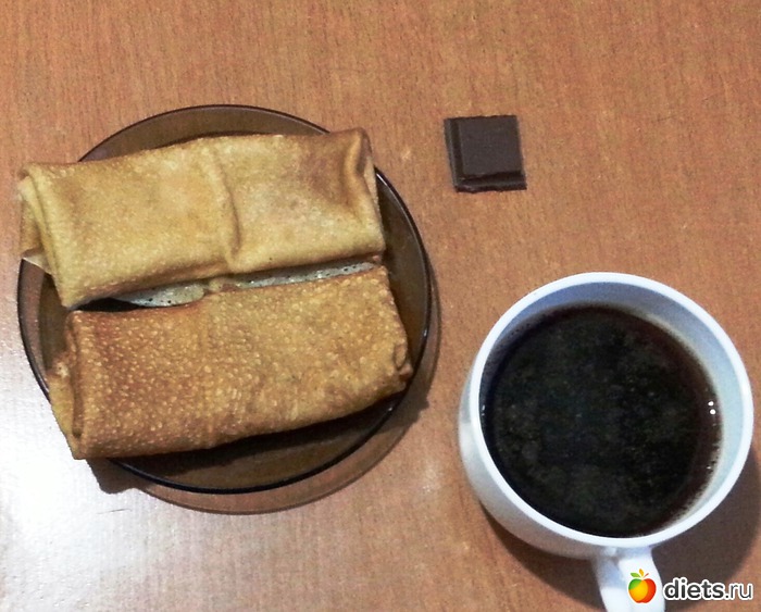 Завтрак:Блины 2 штуки с сыром внутри (немного совсем), долька шоколада и кофе