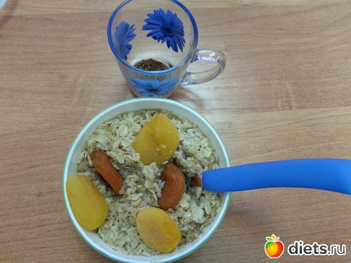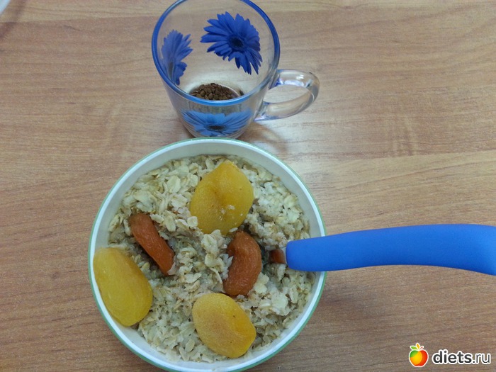Ланч:Каша из овсяных и гречневых хлопьев на воде с 1 ч.л. меда и курагой, кофе 50мл