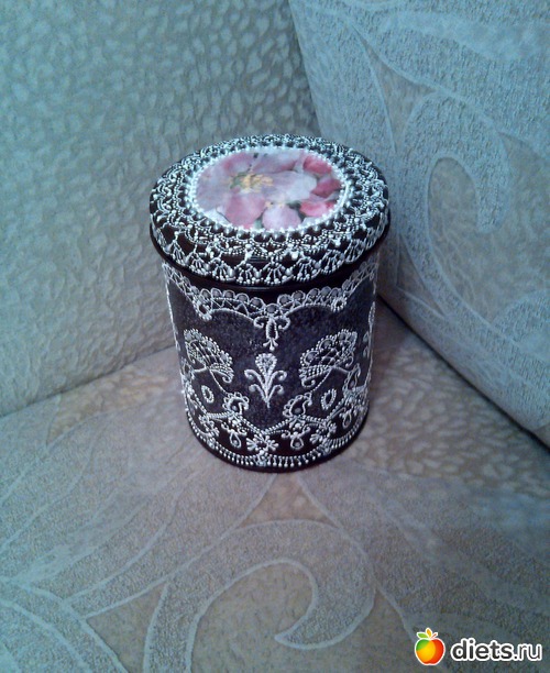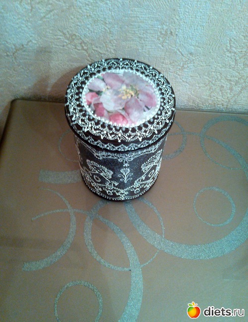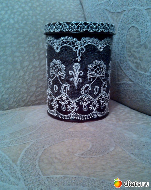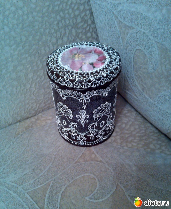 А это - баночка из-под кофе, высота 13 см. Подруга отдала, кофе был просто обалденный, на нём всё было написано по-японски. Подруга варила в кофе-машине эспрессо каждый раз, как я к ней наведывалась, пока кофе не закончился. Запах до сих пор остался, а баночка "нарядилась":