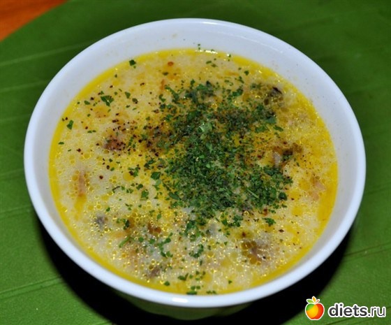 Положить к картофелю морковь с луком, сыр порезать кубиками и тоже кинуть в кастрюлю. Размешивать суп, пока сырки полностью не разойдутся в кипятке. Посолить по вкусу. Варить в течении 30 мин. Перед подачей посыпать мелко нарезанной зеленью.
