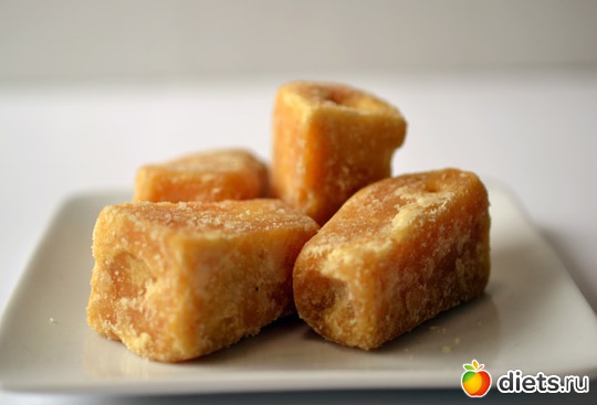 Заехала сегодня за продуктами в китайский магазин и... интуиция, что ли сработала, вижу коробочка с такими хорошенькими кусочками карамельного цвета. Читаю надпись Palm sugar. Значит что то сладкое, с виду не жирное, короче хочу-хочу-хочу... На упаковке написано что это 100% пальмовый сахар, жиров нет, углеводов 4г в одном кусочке, калорий 20. Ну я и взяла. Дома села чай пить- ну правда вкусно. И я полезла в интернет, ознакомиться, что ж это такое ПАЛьМОВЫЙ САХАР. Вот решила поделиться с вами, потому что очень мне понравилась та информация, что я нашла