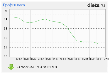 Такой вес я не видела уже очень давно и, главное, никакого дискомфорта и потугов для сбрасывания. Я ориентируюсь на комфорт в теле, на моральное и физическое удовлетворение от приема пищи и вес уходит. Интересно чем это все у меня закончится. Но, вобщем-то, уже хорошо. Ушел страх растолстеть. Ушел страх зажоров. Их просто нет. Да и зачем, если сытно и вкусно. Даже объедаюсь
