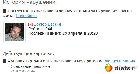 Звонцова Мария это руководитель проекта diets.ru Жалобы на него никто не подавал. Рекламы он никакой не делал потому что писал только здесь. За что же ему поставили черную карточку?