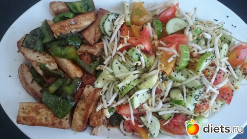 Обед. Сегодня день с тофу.. Пожарила тофу и перчик и сделала салатик - огурчики. помидорки, пророщенные зерна, чесночок и немного кунжута..
