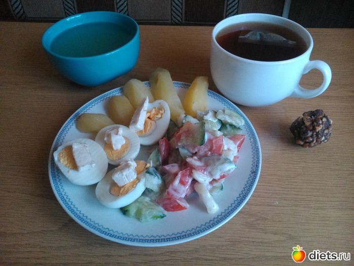 Обед - куриный бульон, салат, картофель вареный, 2 яйца, чай и десерт из печенья... Десерт не удался, сильно сладкий и совсем вкус шоколада не чувствуется... Читать полностью