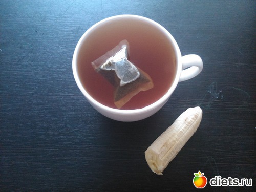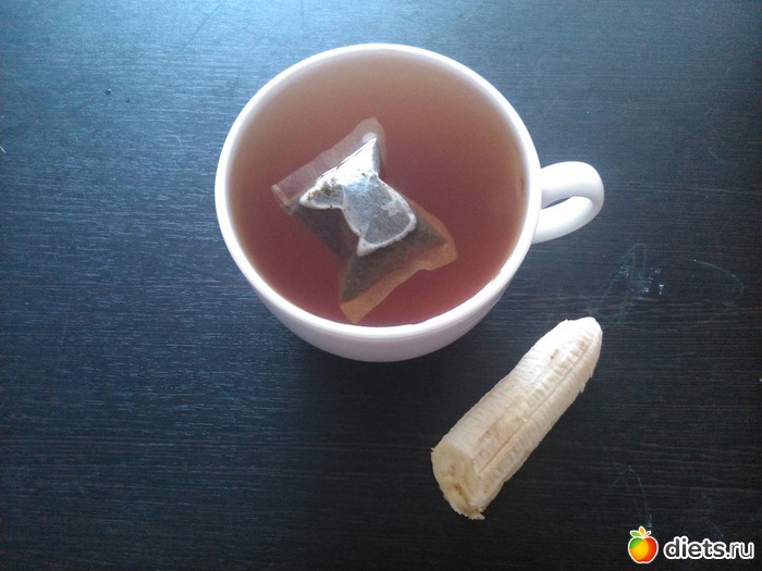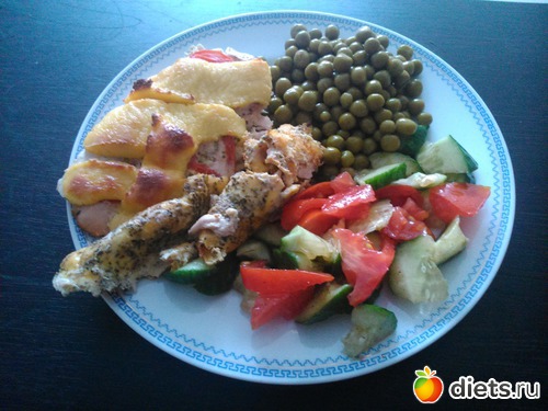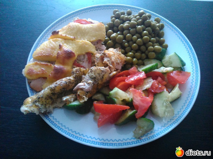 Обед - куриная грудка под помидорами и сыром (когда готовила залила омлетом), горошек, салат, чай и банан...