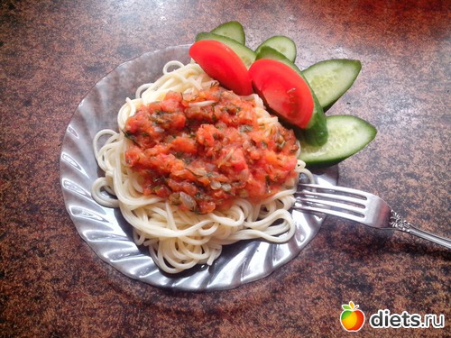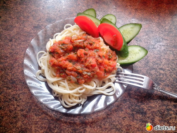 О - спагетти, томатный соус, огурец свежий